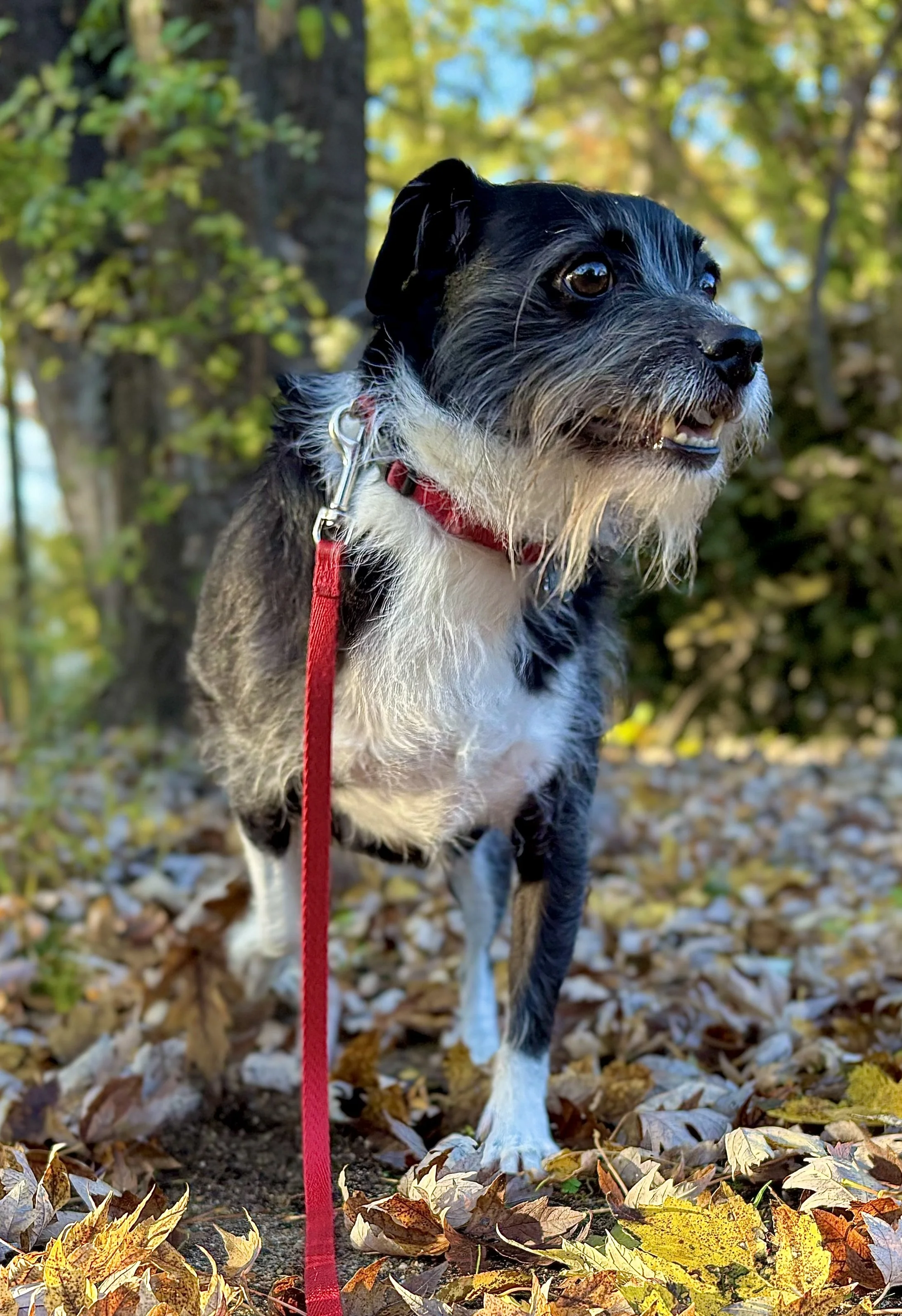 Petey spots a squirrel on our morning walk through the autumn leaves.