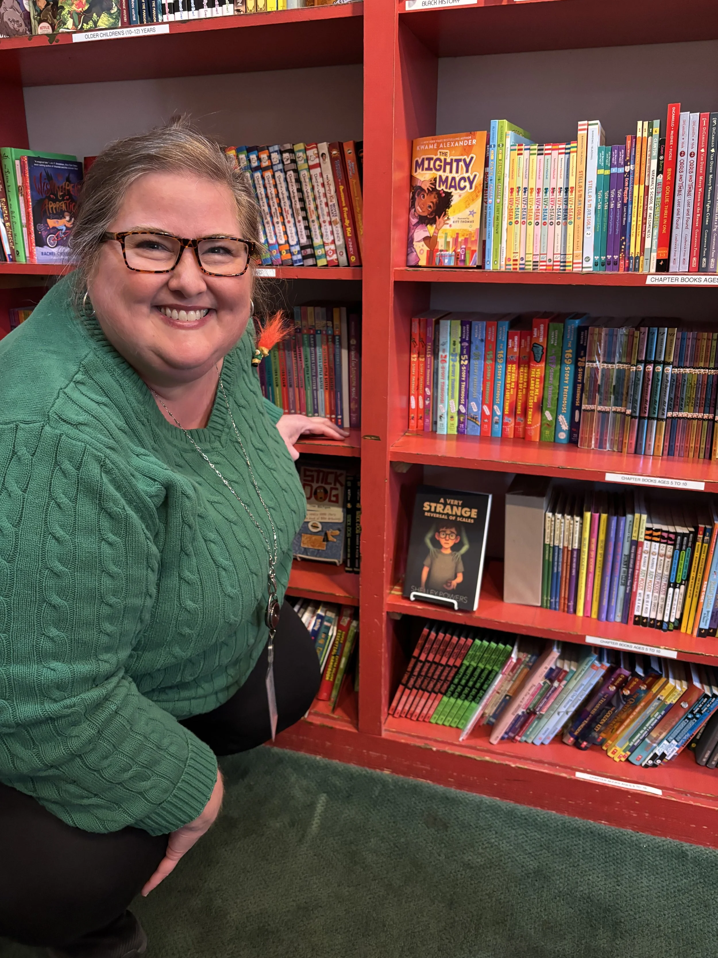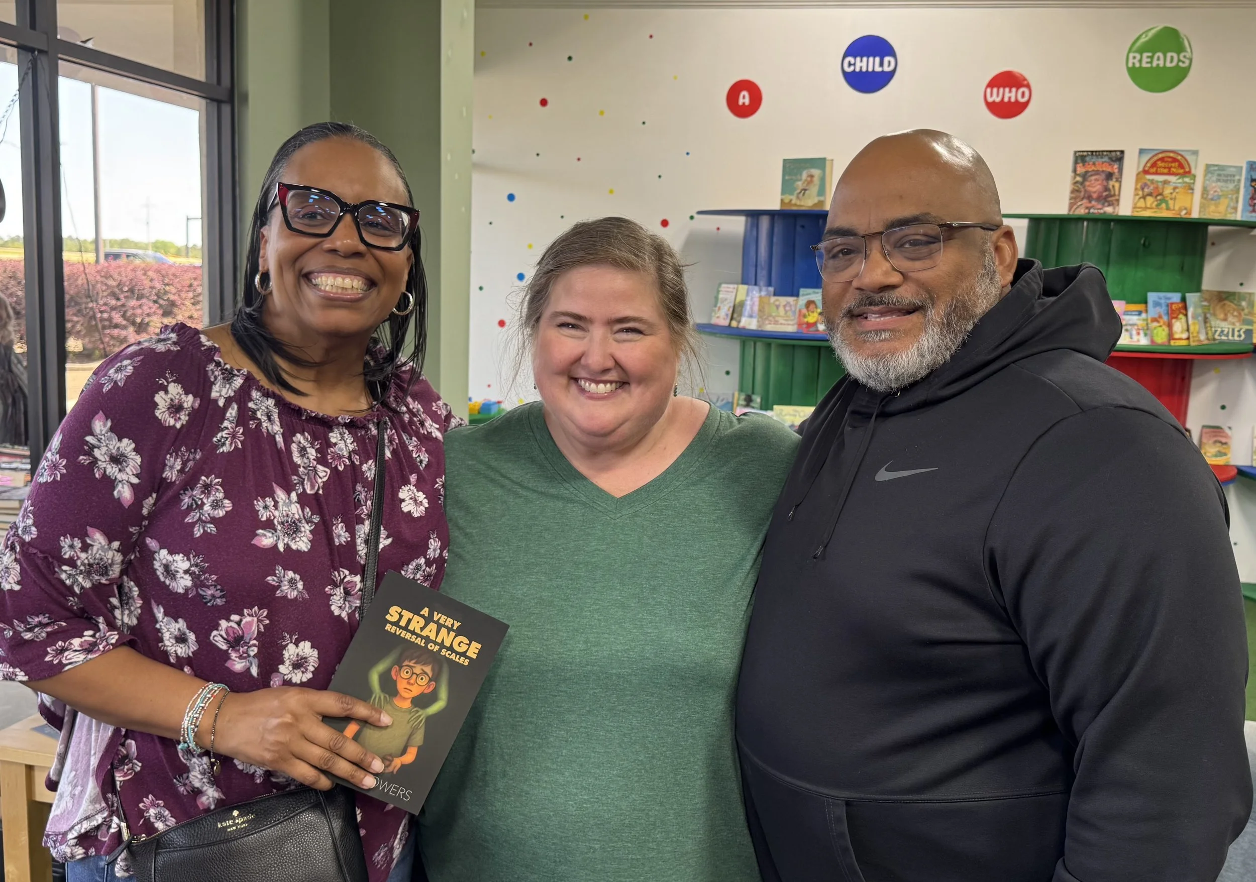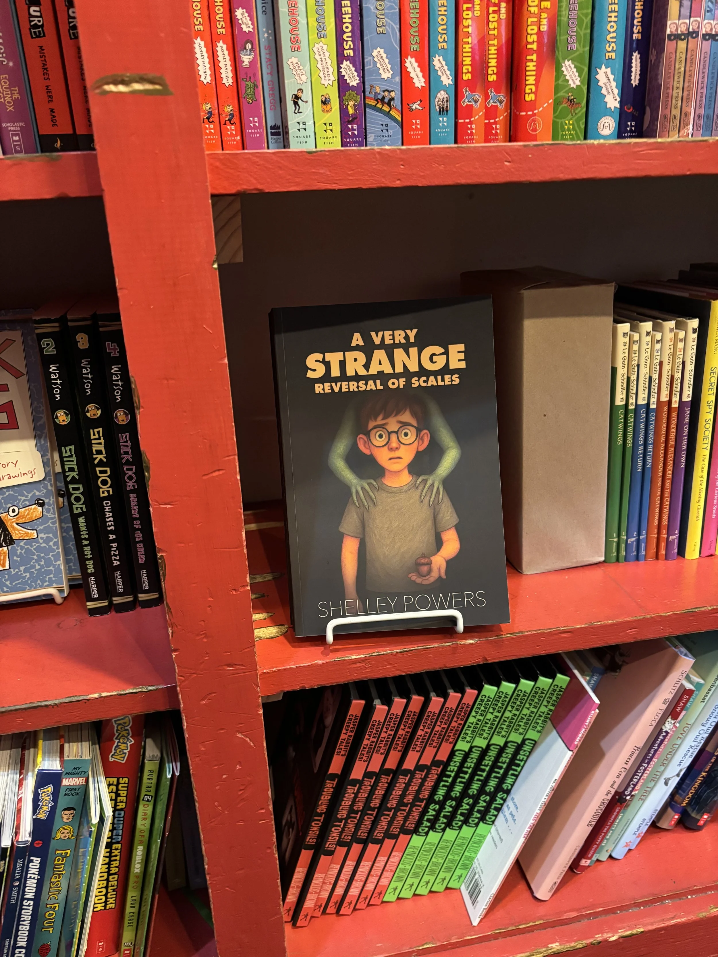 I stopped in at Lemuria Books on St. Patrick’s Day to drop off a marketing packet for How to Fry Chicken & Ditch the Nightlight. Little did I know that sitting on a beautiful red shelf in the children’s section were copies of A Very Strange Reversal of Scales. Talk about finding a pot of gold! I was ecstatic!